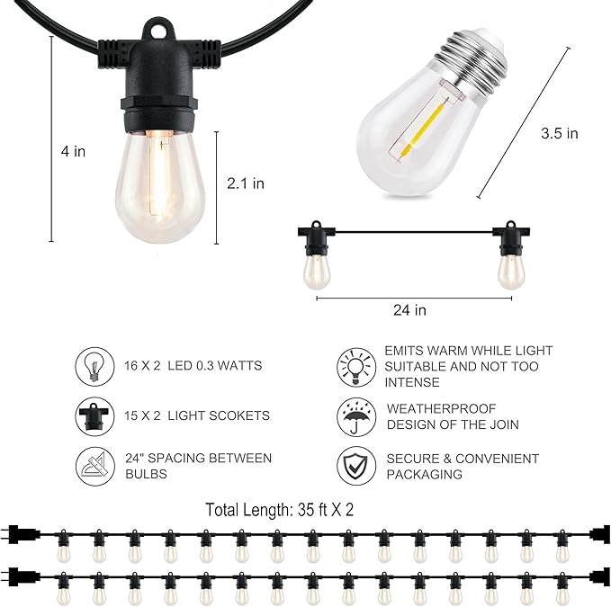 - Commercial-Grade Durability ♥ Total length 35 feet, 18 count hanging sockets with warm white S14 LED bulbs. space each light 20 inches apart,5.5 ft leads, 1 ft tails, provides ample coverage for any outdoor setting. The 18AWG core is wrapped in strong rubber, and the sockets are made from durable, flexible rubber, ensuring longevity and reliability in any weather condition.