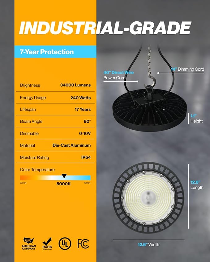 - ✅ COMMERCIAL-GRADE - With its shatter-resistant aluminum housing, our UFO High Bays replace outdated HID fixtures with resilient & durable illumination. IP65 waterproof rating ensures reliable, bright light in any weather. UL & DLC certified.