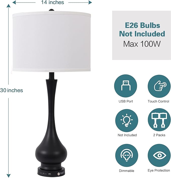 - Practical USB Charging Port: These bedroom lamps come with USB charging port, being convenient to satisfy your charging demands. In addition, various electronic devices, such as smart phone, iPad, earphone, laptop, e-book or humidifier, can be charged even when these bedside lamps are off. With an E26 socket(Min 60W, Max 100W, COMPATIBLE 120V, BULBS NOT INCLUDED).