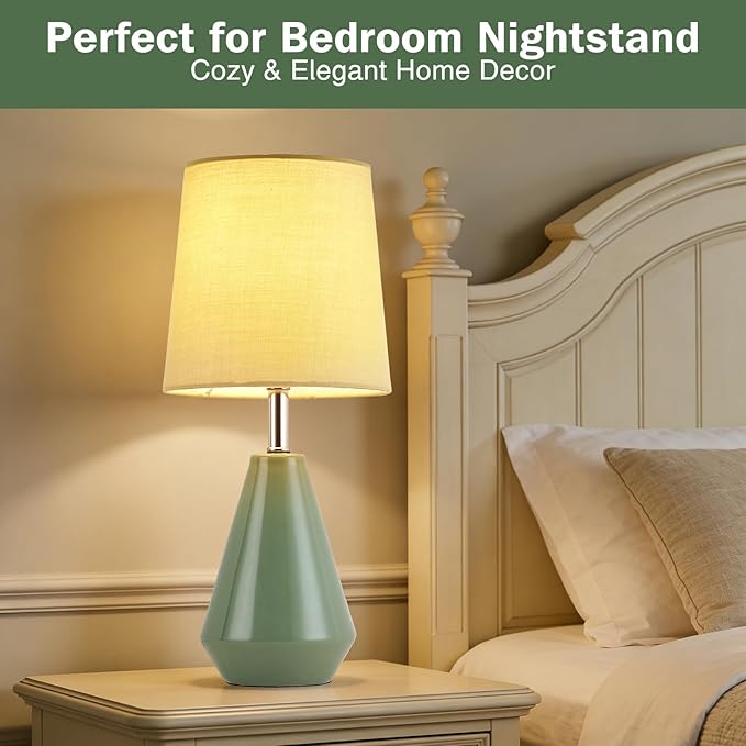 Small Bedside Table Lamp for Bedroom-Reading Desk Lamp Set of 2,with 3 Color Temperatures,15.5" Nightstand Ceramic Lamp with Fabric Shade for Kids Room,Living Room,Dorm,Home Office (Green)