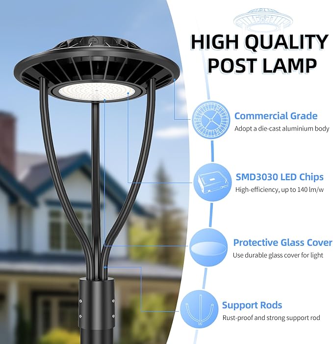 - COMMERCIAL GRADE MATERIAL: The post top pole light with high power factor >0.9 adopt a heavy-duty die-cast aluminium housing and durable glass cover, providing excellent heat transfer, and extends more than 50,000 hours lifespan