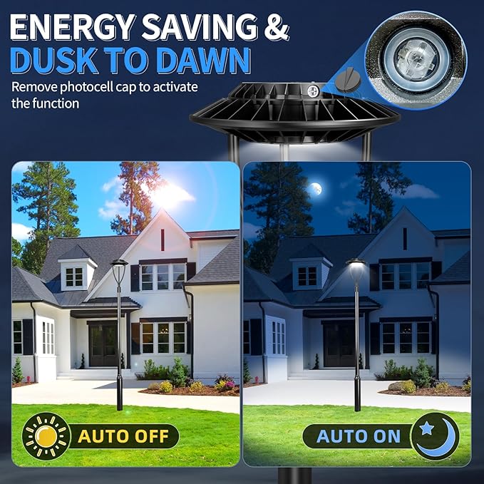 - Dusk to dawn & IP65 waterproof: The LED post top lights with photocell sensor, auto light OFF in daytime and ON at night by detecting the brightness of the surroundings. The IP65 LED car park light can withstand all weather conditions and the driver's built-in 6KV overvoltage protection device