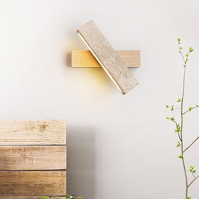 - 【Unique Travertine & Wood FusionEmbrace Wabi Sabi style with this modern minimalist wall sconce, featuring intersecting bars of genuine beige travertine stone and solid wood (select Natural or Walnut finish) for striking accent lighting.
