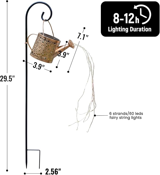 - 【Unique Garden Decorative Lights】This solar watering can lights is designed to resemble a kettle. When the light flickers, it gives the impression that solar light is continuously pouring out of the solar watering can and flowing over the flower beds and lawns.