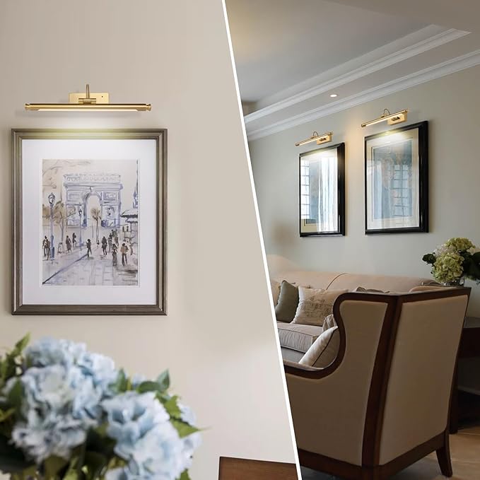 Wireless 15.7in Gold Brass Picture Light – Rechargeable LED Wall Art Lamp with Remote Control, Timer, Adjustable Arm, 3 Color Temperatures & Stepless Dimming, for Living Room and Gallery Lighting
