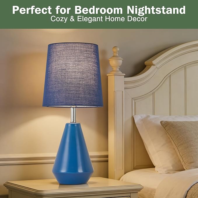 Small Bedside Table Lamp for Bedroom - Reading Desk Lamp with 3 Color Temperatures,15.5" Nightstand Ceramic Lamp with Fabric Shade for Kids Room,Living Room,Dorm,Home Office (Blue)