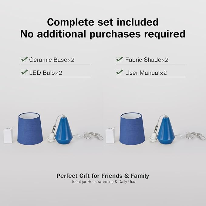 Small Bedside Table Lamp for Bedroom-Reading Desk Lamp Set of 2,with 3 Color Temperatures,15.5" Nightstand Ceramic Lamp with Fabric Shade for Kids Room,Living Room,Dorm,Home Office(Blue)