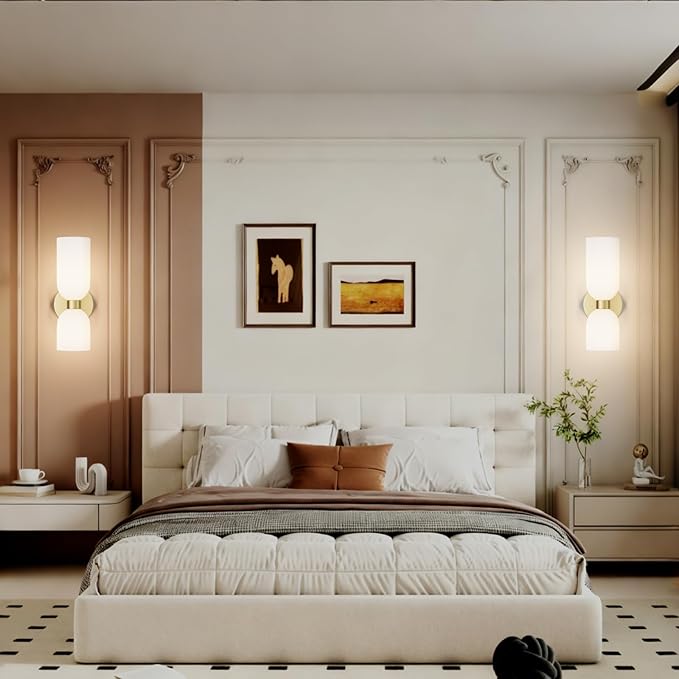 - [High Quality & Vintage Desgin]:The 2-light modern wall light fixture features a sophisticated polished gold metal finish, bringing timeless elegance to any space. And explosion-proof frosted white glass lampshade well protects the bulb and soften the lighting glow,and increases the classic ambiance in any space.This bathroom light fixtures perfectly fit with any style,from modern to rustic and ideal for a variety of home decor.
