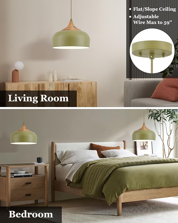 ELYONA Vintage Pendant Light Fixtures with Faux Pine Wood Grain, 12 Inch Adjustable Hanging Light Moss Green Metal Shade, Mid Century Modern Nordic Pendant Lamp for Kitchen Island Dining Room Bedroom