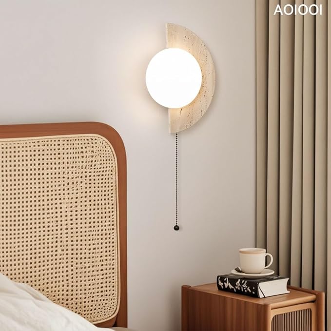 - Japandi Travertine Half-Moon Design: Embrace the serene beauty of this Japandi half-moon wall sconce, meticulously crafted from natural travertine stone and a luminous glass globe. Its minimalist, organic design introduces a tranquil Wabi-Sabi aesthetic, transforming your space with understated elegance.